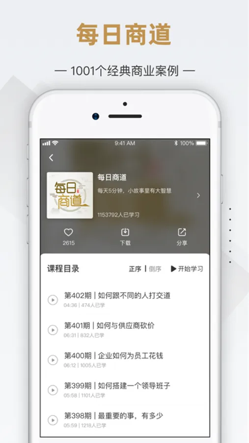 2、 免费音频每日推送——每天3分钟微课堂,在小故事里讲商业本质,把握商业脉搏;