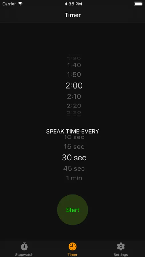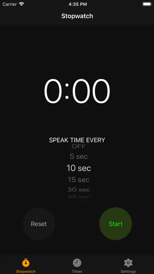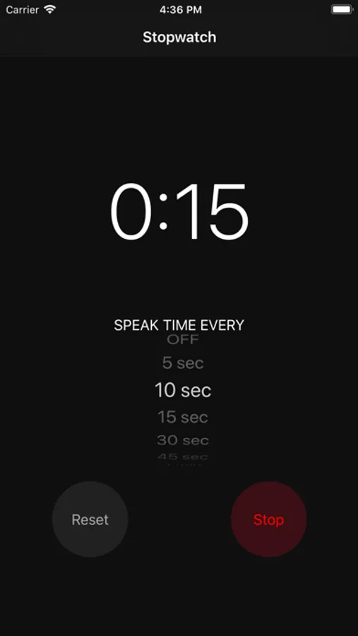 Stopwatch: The app speaks out the elapsed time at the specified interval. Example: "5 seconds", "10 seconds"....1 minute 30 seconds" and so on until stopped.