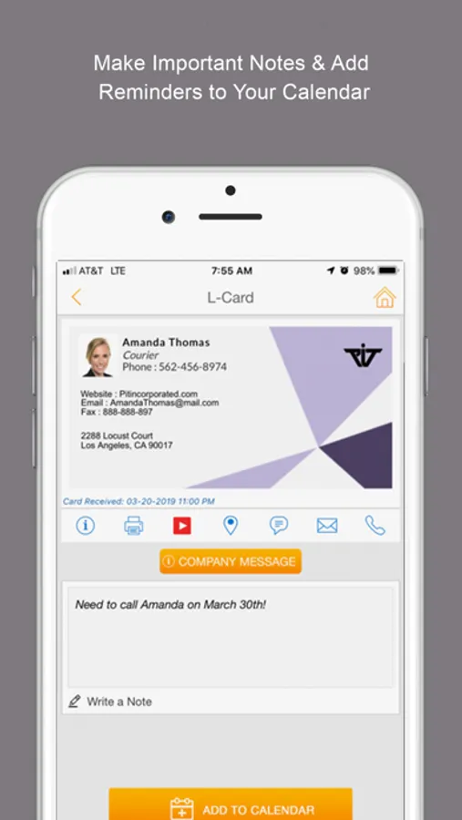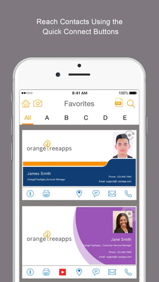 * Call, Text, or Email your contacts directly from a selected card using the Quick Connect Buttons.
