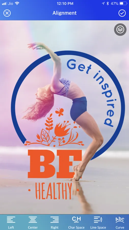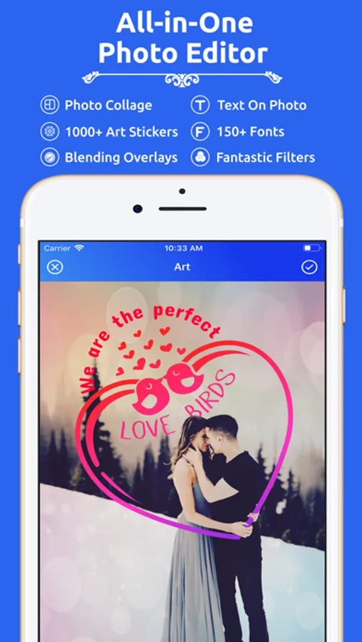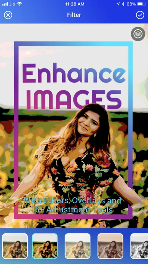 Convey your message in the most beautiful way by adding stickers, Artwork or text on photo. You can choose from more than 150 plus handpicked font to suit your style. The caption can be enhanced with alignment tool which allows you to adjust character and line spacing, curve your caption or text.