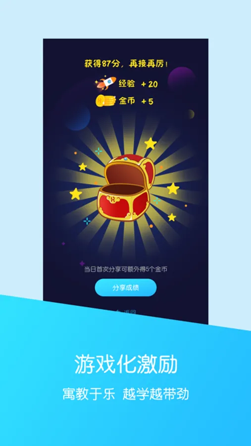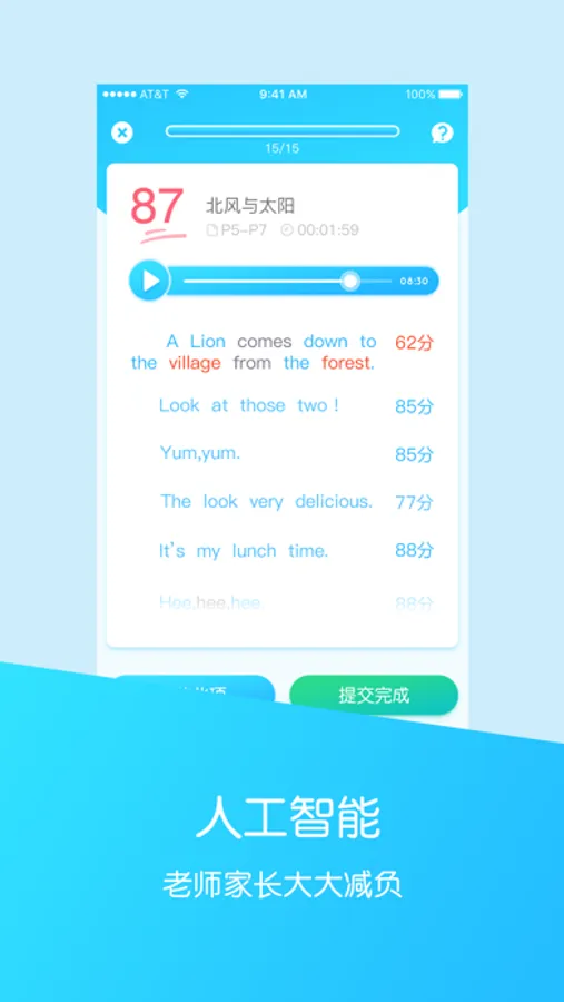 通过练习巩固课堂知识,成绩满意再提交给老师。跟读、背课文、做课后练习等均可获得积分,获得更好班级排名。