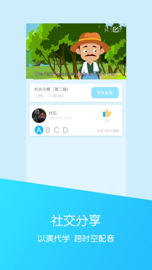角色配音功能让孩子在优美地道的英语配音指导下大胆发声、尽情演绎绘本和动画的角色、讯飞智能语音技术为配音表演精准打分,能把自己的配音作品分享到朋友圈,精彩的配音还有机会上榜“高手秀场”,被所有的小朋友看到。