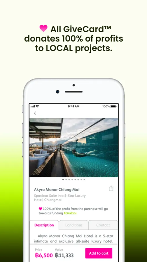 Shop and give: Shop lifestyle expereinces, whether it's hotels, restaurants or activities, within few simple clicks. 100% of profits from all giftcards purchased will go to support local charity in Thailand.