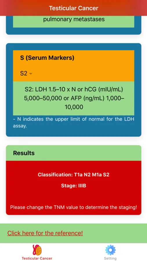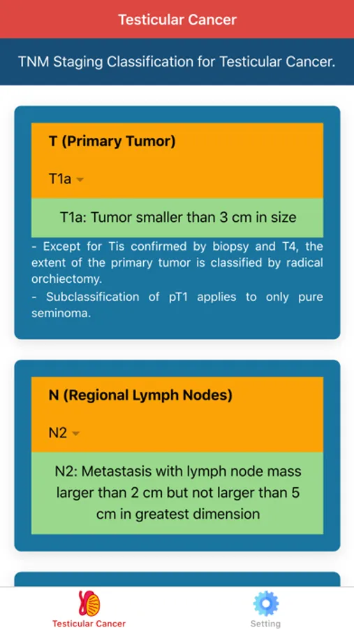 The staging of testis cancer refers to how far the cancer has spread. Staging in "Testicular Cancer Staging: Urology Oncology" is determined with information from the orchiectomy, tumor markers and imaging studies. "Testicular Cancer Staging: Urology Oncology" is an app to help medical doctor or urologist to stage testicular cancer using the TNMS system. T (tumor), N (node), M (metastasis), and S (serum tumor markers).