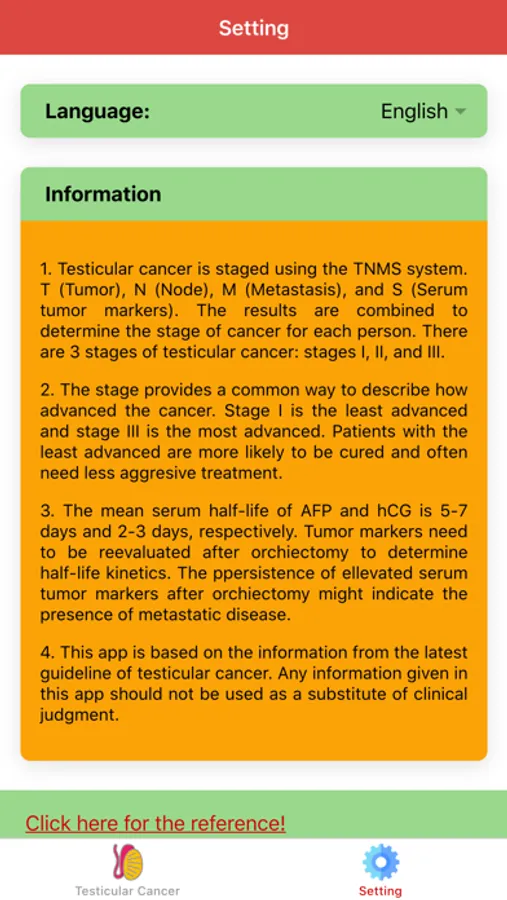 In “Testicular Cancer Staging: Urology Oncology” app, information from the orchiectomy, tumor markers and imaging studies are combined to determine the stage of cancer for each person. There are 3 stages of testicular cancer: stages I, II, and III. Stage I is the least advanced and stage III is the most advanced. Patients with the least advanced are more likely to be cured and often need less aggressive treatment. "Testicular Cancer Staging: Urology Oncology" app is based on the information from latest guidelines on testicular cancer. Any information given in this app should not be used as a substitute of clinical judgment.