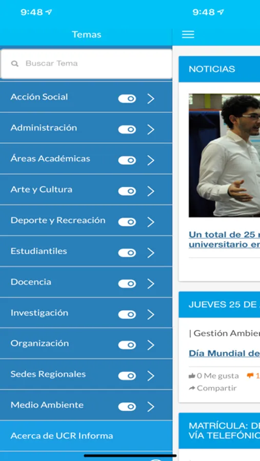 En el 'side menu' podrá filtrar la información según el tema principal y los temas secundarios asociados de su preferencia.