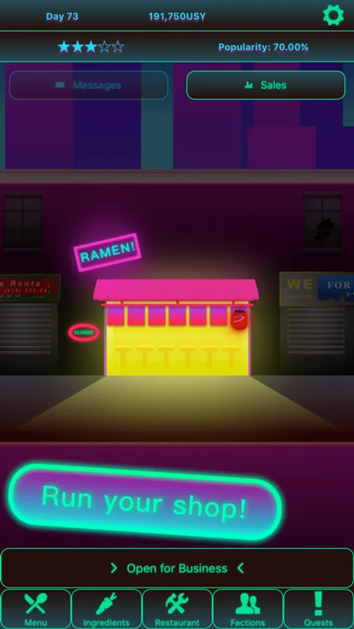 It’s the year 2083. Humans are rare, and hordes of demented robots now roam the streets. As one of the last humans alive, you have a chance to find success running a ramen shop. It won’t be easy though. You'll need to create dishes that satisfy strange customers, serve bowls quickly, upgrade your restaurant, and develop relationships with the city’s most powerful factions.