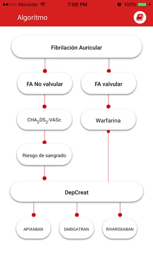 La aplicación nos lleva en forma intuitiva sobre un algoritmo para el manejo de anticoagulación oral en pacientes con FA, empieza al tocar el icono de fibrilación auricular mostrando un ejemplo de esta en forma sencilla para su identificación.