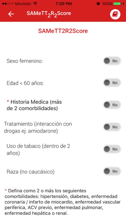 En el icono de FA valvular, la aplicación lo llevara a la indicación absoluta de anticoagulación con warfarina. Luego al hacer click en el icono de warfarina, esta lo envía a determinar un score de riesgo SAMeTT2R2 score que evalúa la probabilidad de que el paciente tenga mayor chance de alcanzar el mayor tiempo en rango terapéutico (TRT) así: Si el paciente tiene un score del SAMeTT2R2 score es menor que 2, esto sugiere que el paciente tendrá una mayor probabilidad de alcanzar un tiempo en rango terapéutico (TRT) mayor que 65%; pero si el valor del SAMeTT2R2 score es mayor que 2 estos pacientes tendrían menor probabilidad de alcanzarlo, y por lo tanto se recomendaría un manejo más intensivo o en una clínica de anticoagulación con vigilancia y seguimiento más estrecho. Luego de calculado SAMeTT2R2, el cual se encuentra dentro de la aplicación, el algoritmo lo llevara a la recomendación del INR adecuado para el paciente con FA. (INR entre 2.0 y 3.0).