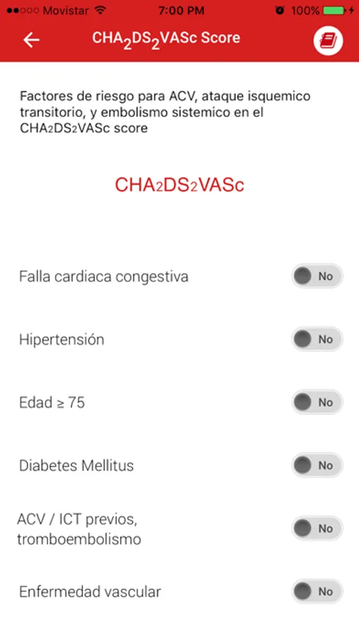 Si el paciente tiene FA no valvular, el click en ese icono, lo dirigirá a evaluar el CHA2DS2-VASc que indicará que paciente no requiere ningún tipo de anticoagulación ni anti-agregación (CHA2DS2-VASc = 0). También el score nos informara el riego anual de ACV (Ataque cerebrovascular isquémico cardioembolico). La indicación y la evidencia del uso de este score viene incluido en la app. Posterior a esta calculo la app lo dirigirá a la evaluación de riesgo de sangrado con el HAS-BLED (También incorporado en la app), y el resultado se presentaría como bajo riesgo o alto riesgo de sangrado así: Si el HAS-BLED es mayor que 3 alto riesgo de sangrado que no contraindica la anticoagulación y solo para modificar los factores de riesgo identificados. En la app también hay lista adicional de factores de riesgo de sangrado usados en otros scores de riesgo.