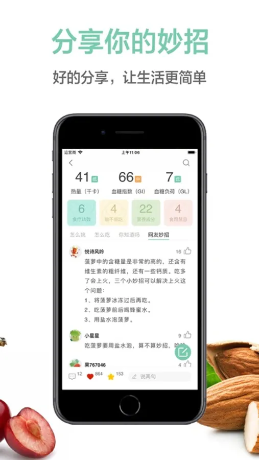 6、健康:提供包含应季、功效、营养、能不能吃、热量、GI、嘌呤、草酸、食在每日、四性、五味11个分类下的果蔬健康饮食指南。