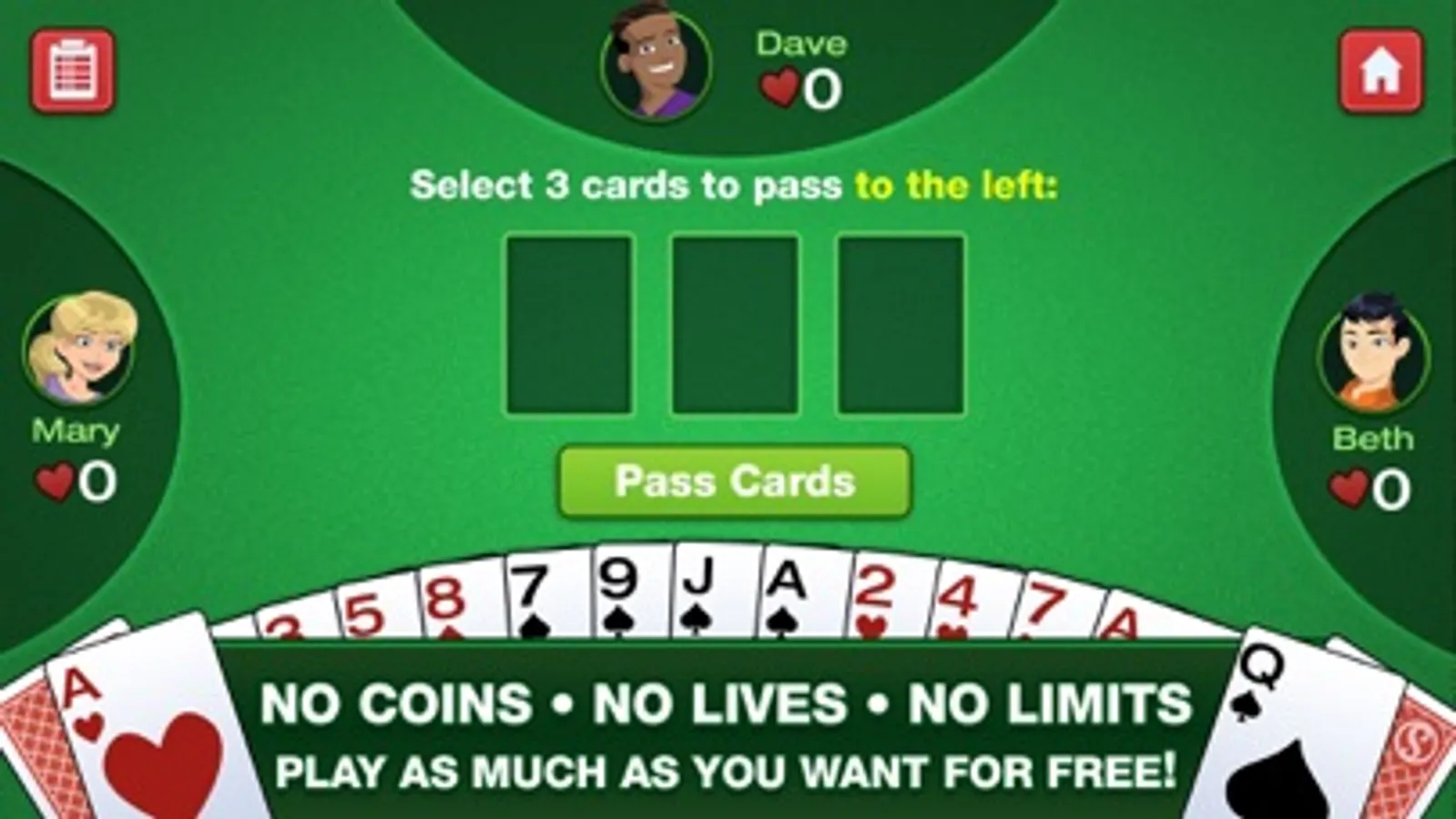 No timer, no lives, no limits. Play a relaxing game of Hearts, online or offline, 100% free!