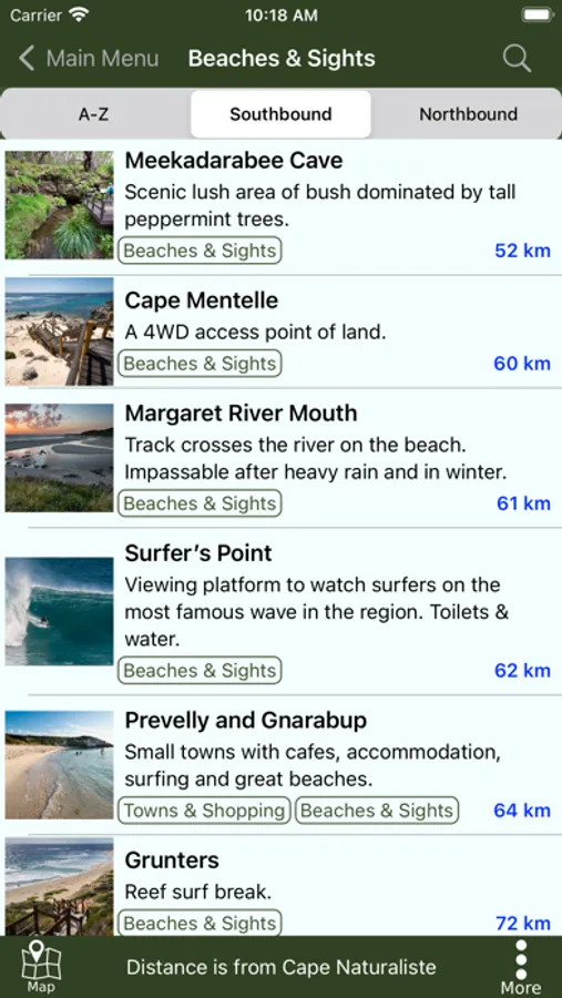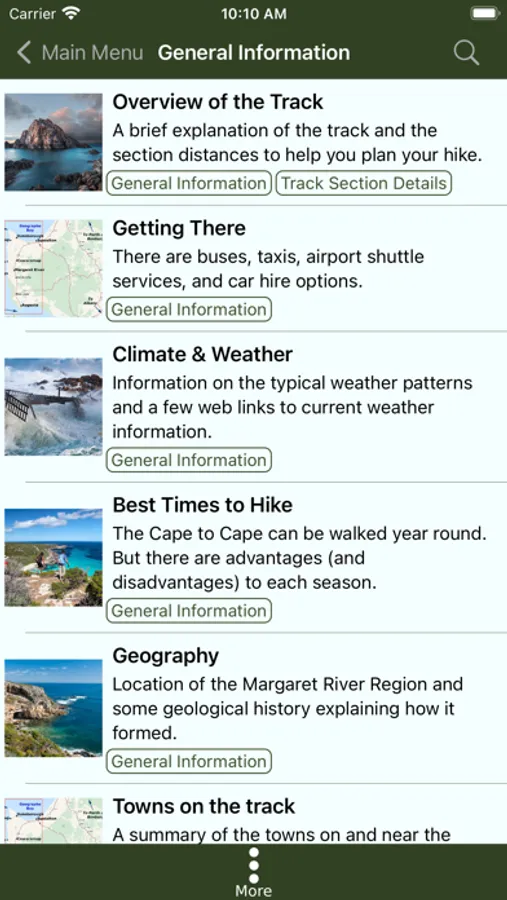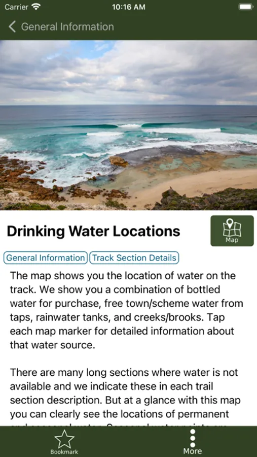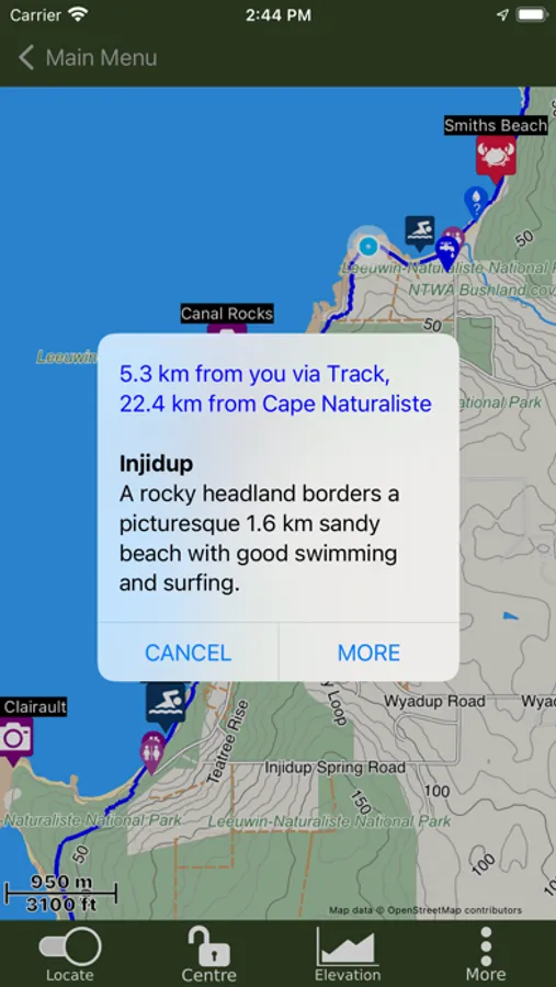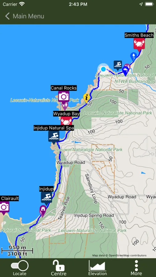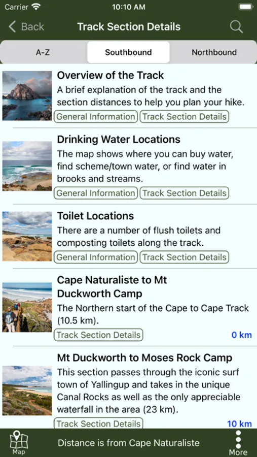 The guide works 100% without needing mobile phone reception or Internet access. The offline maps are very detailed, show the Cape to Cape Track, show where you are via GPS, and are marked up with camping areas, sightseeing, water sources, places to swim, some accommodation, restaurants and food shops, the best beachs, sights and many other points of interest. The App shows you how many kilometres you are from places like camping area and towns, and has an interactive elevation graph so you can see what hills are between you and places.