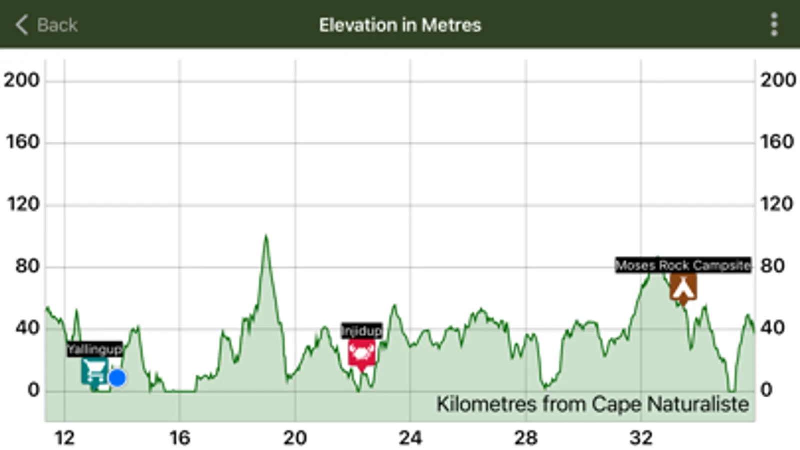 - The elevation graph shows your location and has markers for towns, camping and other places. Use it to see if you have to walk up any big hills to get to that next camping area?