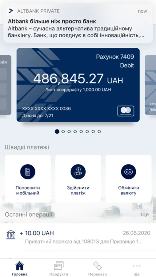 Додаток створено для сучасних клієнтів, які прагнуть отримувати всі банківські послуги у своєму смартфоні та управляти своїми фінансами не відвідуючи відділення банку. Додаток Altbank Private надасть можливість отримувати всю інформацію по рахунках та транзакціях, здійснювати операції між власними рахунками та виконувати зовнішні платежі, а також мати постійний зв'язок з банком та функціонування всіх послуг 24/7.