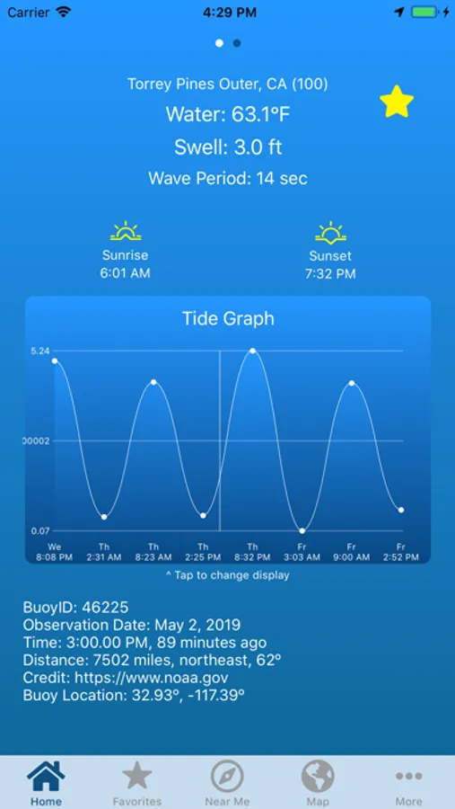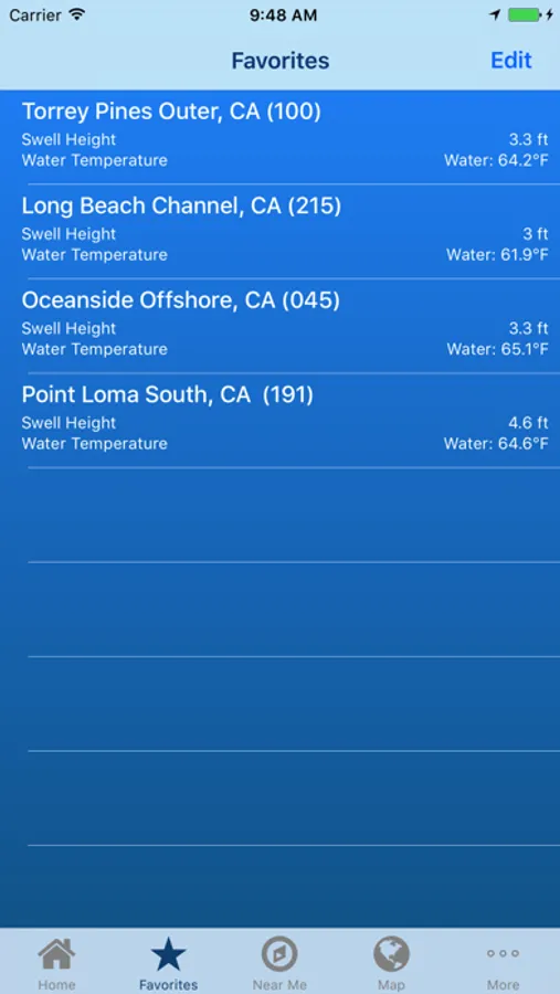 Live scientific readings from ocean buoys around the world. Data is provided by the National Data Buoy Center of NOAA and other public scientific organizations. Most buoys report water temperature and swell height, but some have more information available than others. Automatically select the closest buoy, choose one from the map, or choose from the list. Build a list of favorites for quick access to key buoys. With your device's location function turned on, bearing and distance to the buoy is calculated and displayed. This app is lightweight, easy-to-use, and requires virtually no data usage.