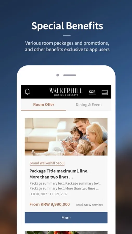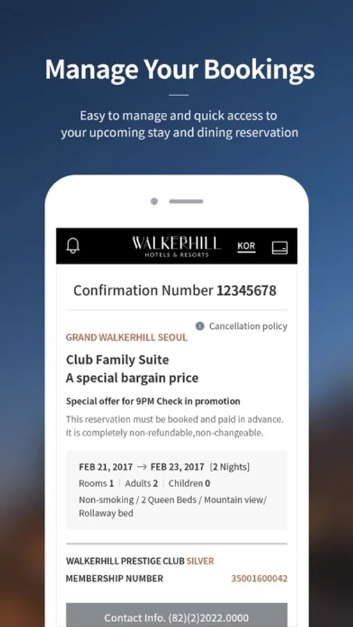 With the Walkerhill App, you can conveniently manage your entire trip to Walkerhill Hotel & Resort in Korea. Join Walkerhill Rewards, our loyalty program, to receive the richest benefits and enjoy exclusive offers for members. The Walkerhill App will help you get the most out of your journey to Korea and ensure a comfortable stay.