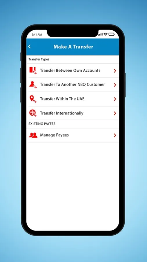 Transfer money to registered beneficiaries for accounts in NBQ, other Banks in UAE and also international Banks outside UAE