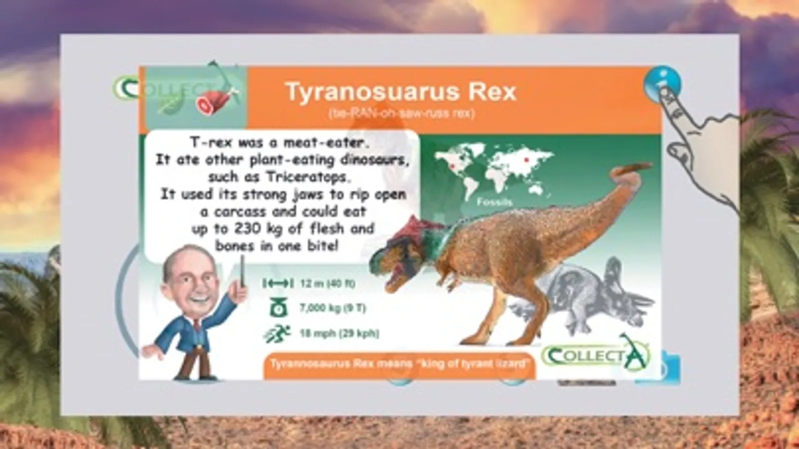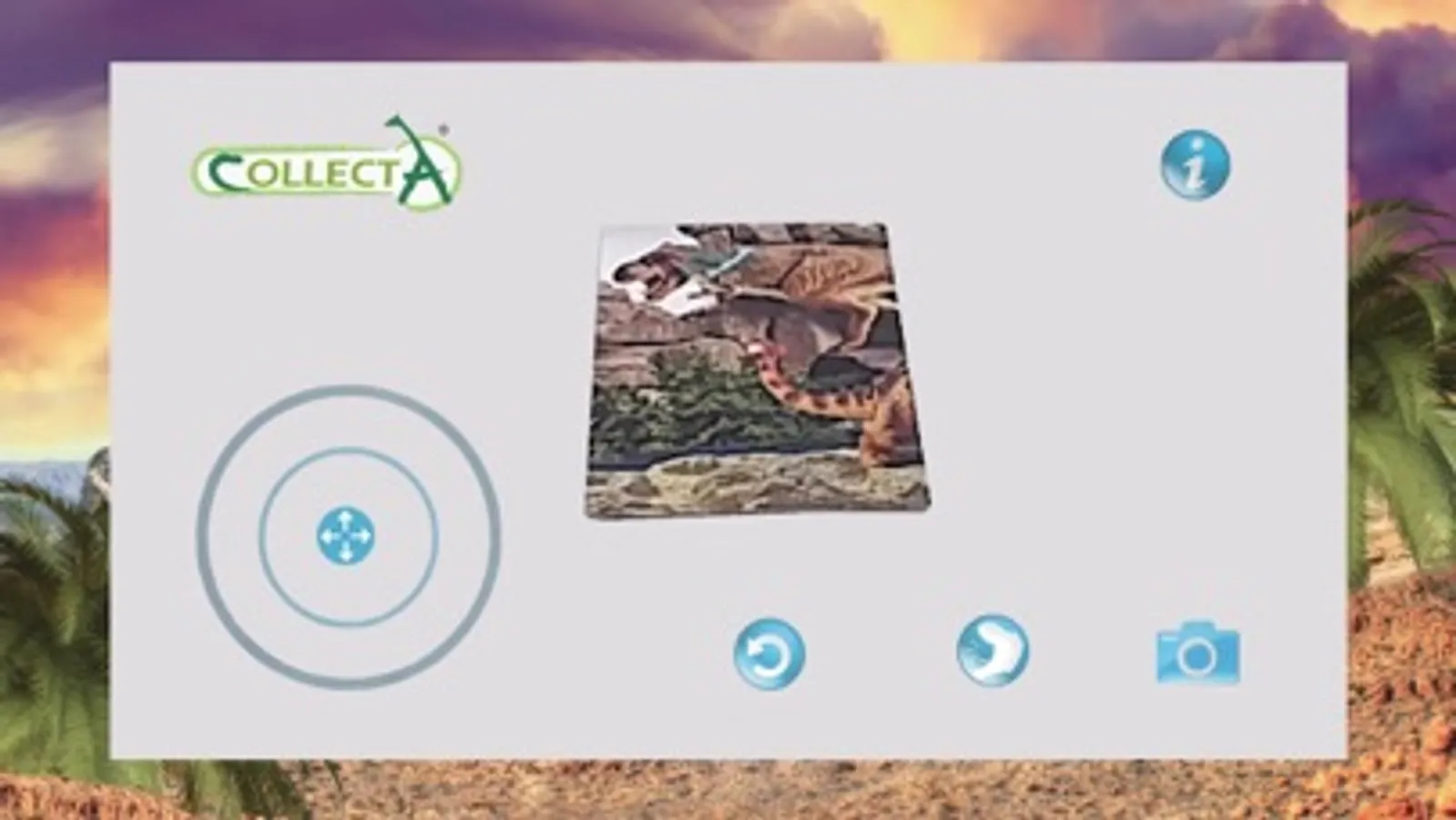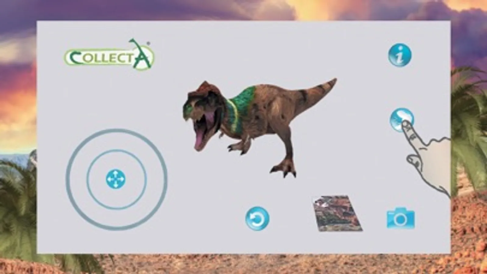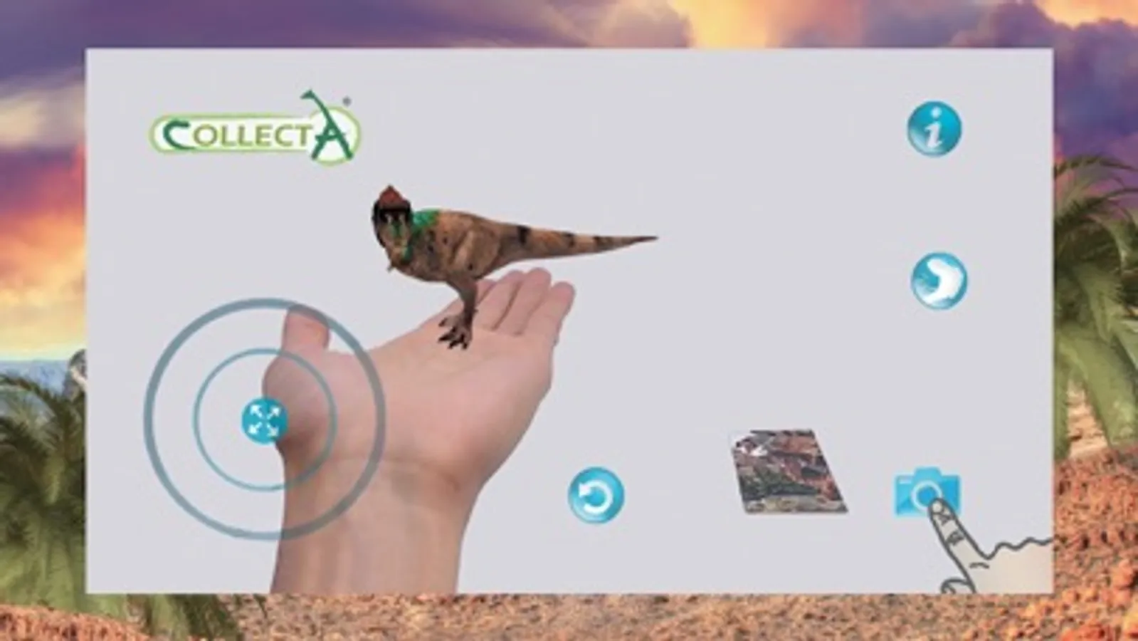 CollectA AR is an augmented reality application that can bring CollectA's prehistoric animals to life. You can activate the dinosaur through the collectible printed fact card. Scan the card and you can control the way the dinosaur moves, adjust it to your desired size, take pictures with it and share with your friends. For immediate experience, please find the card here: http://www.collecta.biz/en/collections/collecta-ar/A1147 You can open the card using another device, lay the device flat and scan the card with your smartphone, tablet or iPad. Or, you can download the card, print it out and scan it with your smartphone, tablet or iPad.