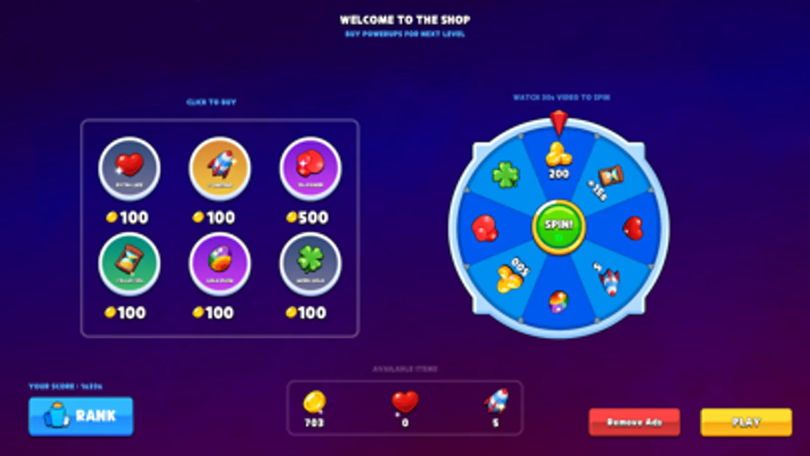 Lucky spinner is added at the end of each level which you can spin and win power-ups by watching a video advert or skip by clicking the skip button.