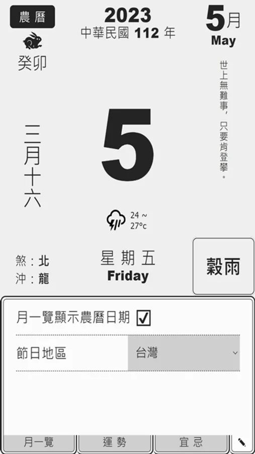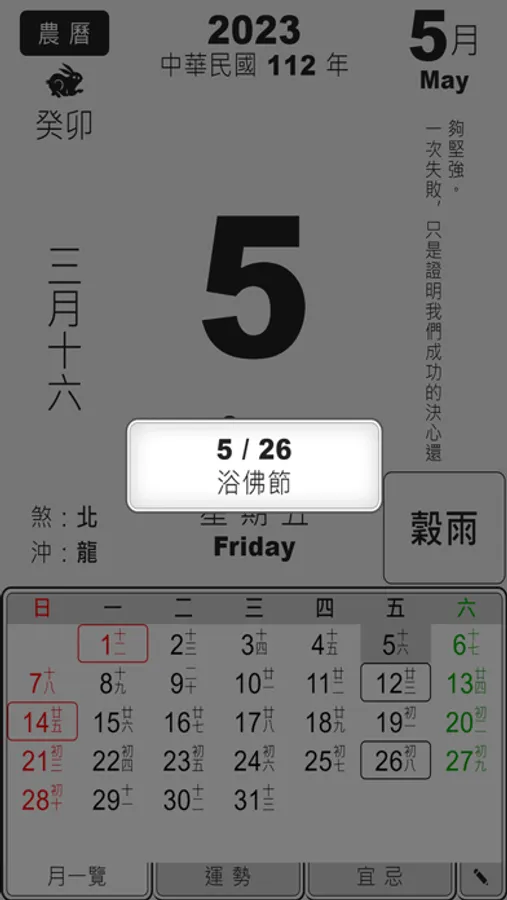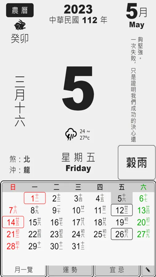 Displays the year, month, day of each day and the next month, month, and day of the lunar calendar. Swipe left and right to switch the date.
