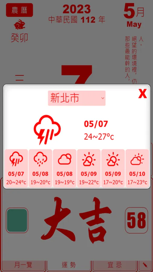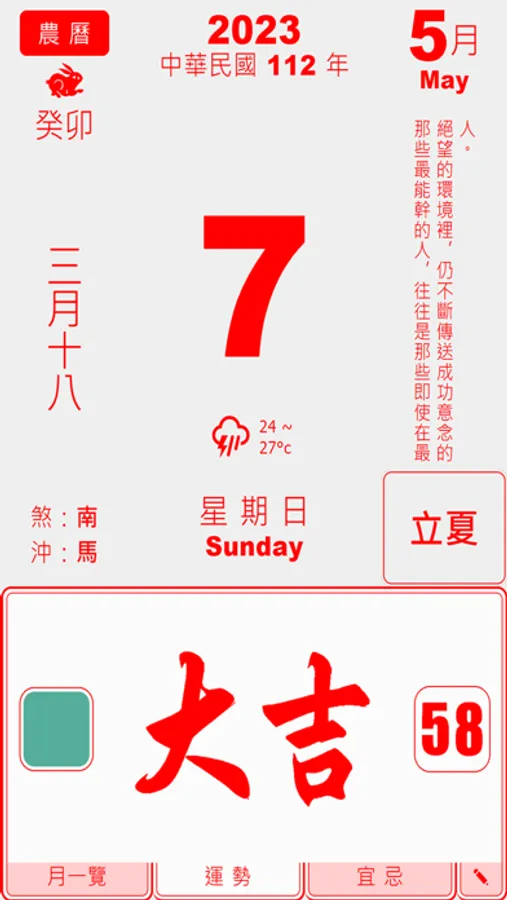 Information such as daily fortune, lucky color and lucky number, the direction of evil spirits and the avoidance of travel events are for reference only and it is recommended not to be overly superstitious.