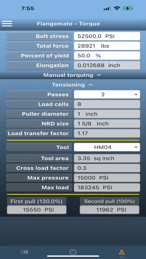 Tensioning tool models are recommended and pump pressures and elongation calculated.