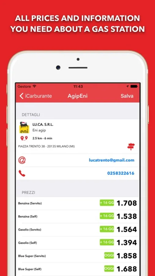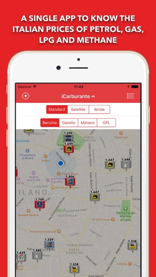• View all the Italian gas stations closest to you on the map, the price will be visible and colored.
