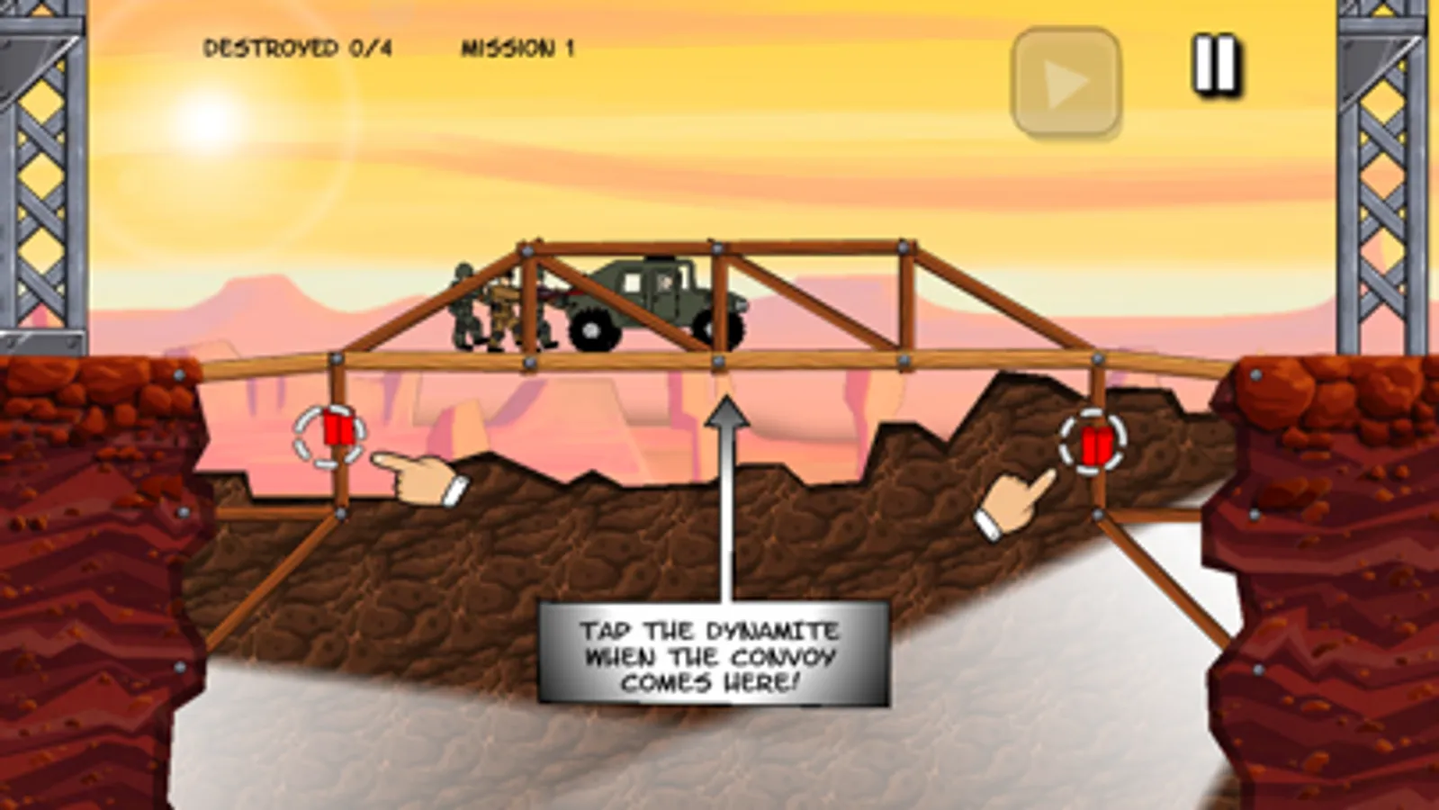 The enemy troops are fast approaching. Quick! Set up a trap on the bridges they have to cross. Different material requires different dynamite to destroy it. Set your dynamite in the right places and blow the bridge when the convoy is trying to cross. It gets hard when the rules of war say to spare the enemy medics.