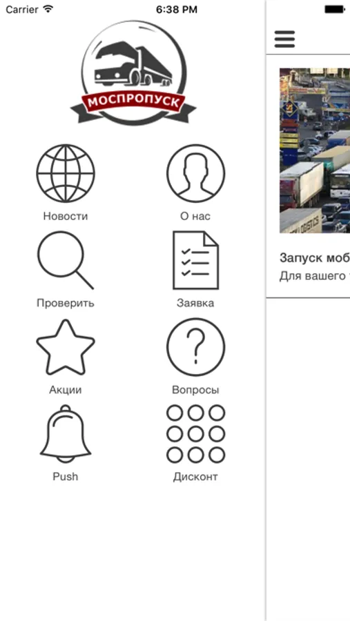 Мобильное приложение для клиентов компании "МосПропуск". Новости, акции, система лояльности, проверка действия пропуска по государственному номеру автомобиля - и всё это в вашем смартфоне!