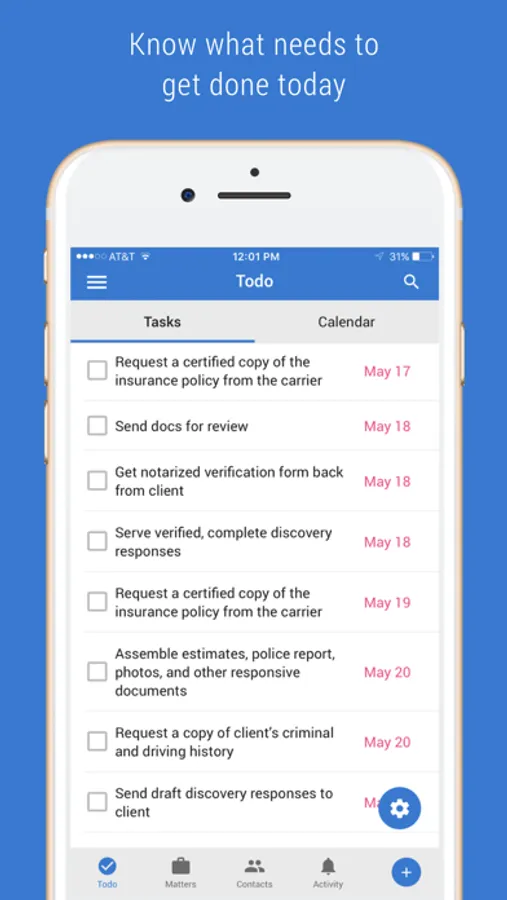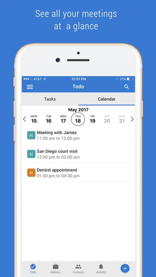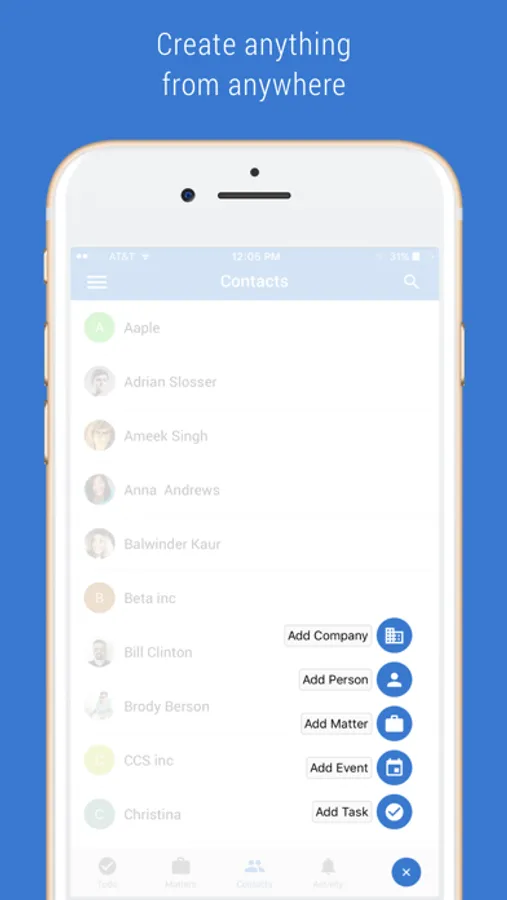 ● Global add button to quickly add tasks, meetings, contacts and matters.