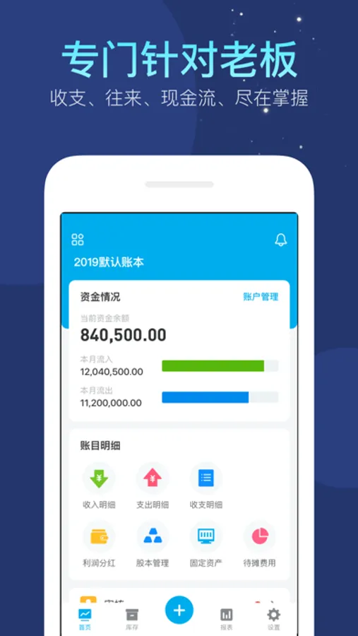 【全能】记进销存、收入、支出、费用、工资、固定资产、股东权益、专业财会报表;
