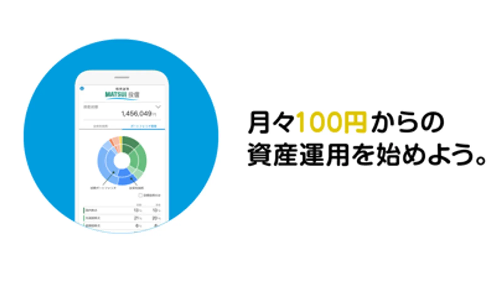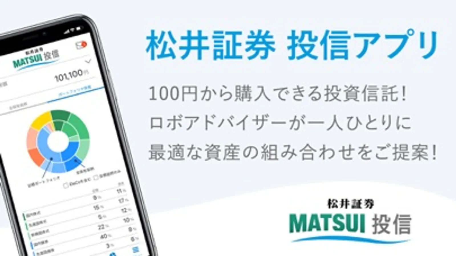 ロボアドバイザーによる提案や購入、運用のメンテナンスなど、豊富な機能を搭載!この松井証券 投信アプリ1つで、国内外の株式や REIT 等を含めた資産形成が簡単にできます。