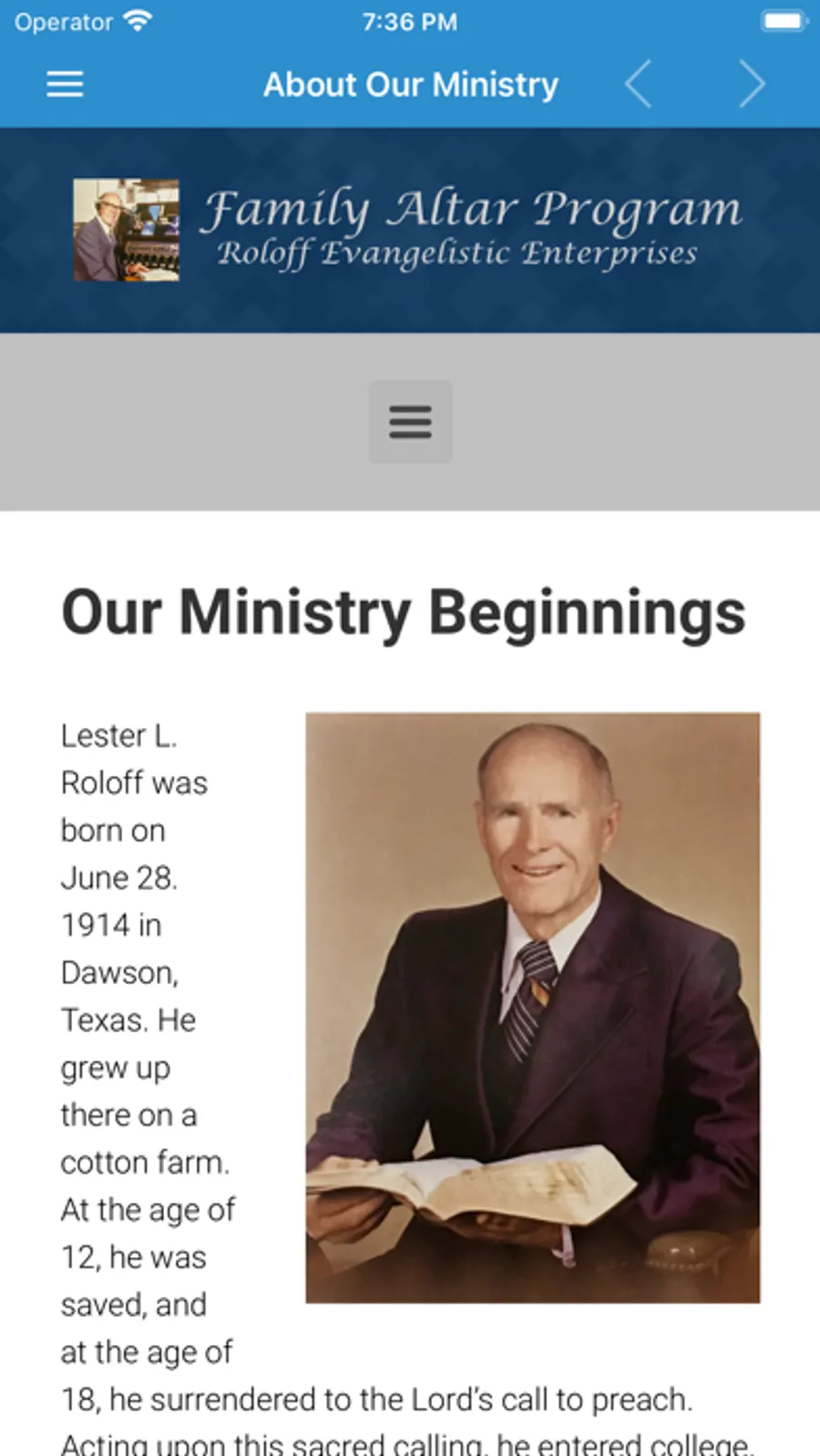 The Family Altar Radio app provides you with preaching from Evangelist Lester Roloff 24/7. The Family Altar Program was founded in 1944 and continues to share the Good News of the saving grace of Jesus Christ over the airwaves and online.