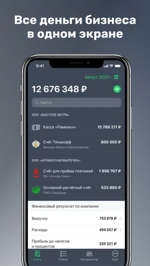 Первый российский сервис управления финансами для бизнеса в смартфоне, интегрированный с крупнейшими банками РФ.