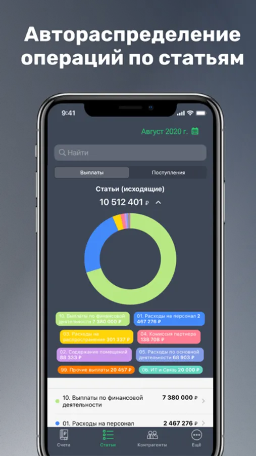 — Авто-распределение доходов и расходов по статьям на основании правил.