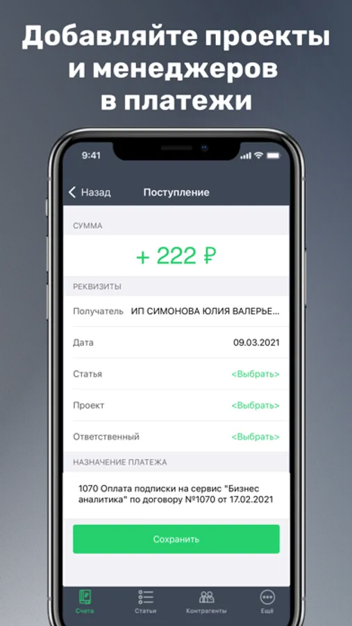 Приложение показывает актуальную информацию по счетам, остаткам и операциям во всех подключенных банках, считает ключевые показатели бизнеса и помогает быстро получать информацию о доходах и расходах в разрезе категорий, поставщиков, клиентов.