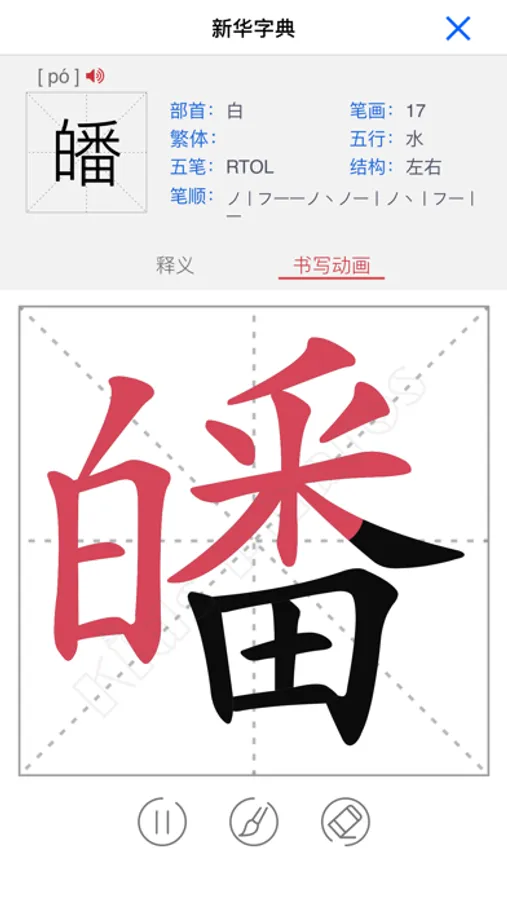 ○ 每个汉字,都带新华字典详细解释、汉字笔顺书写动画、汉字跟写功能。