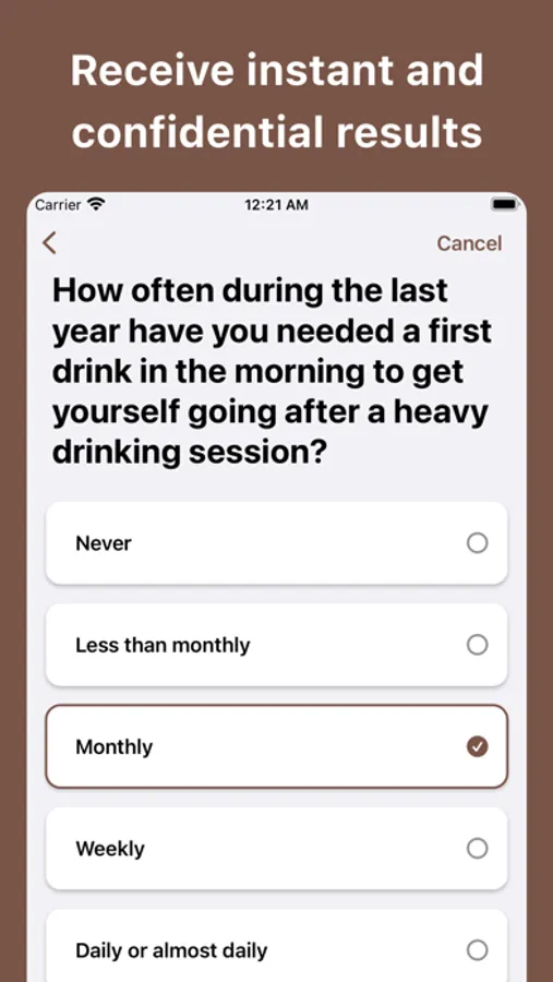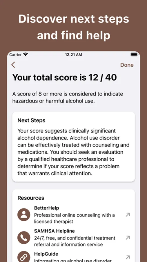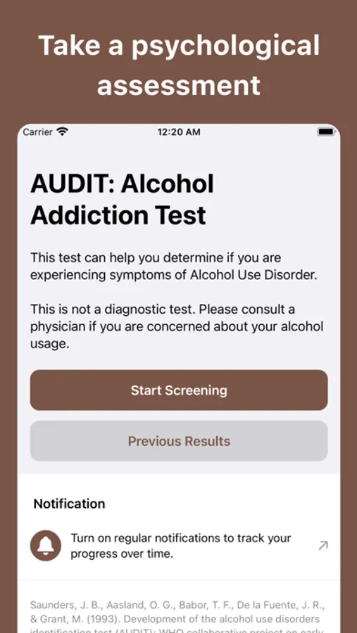 Concerned about your drinking habits? This app helps you evaluate whether or not you may be addicted to alcohol. This app uses the AUDIT Questionnaire, a simple, empirically-based screening for alcoholism.