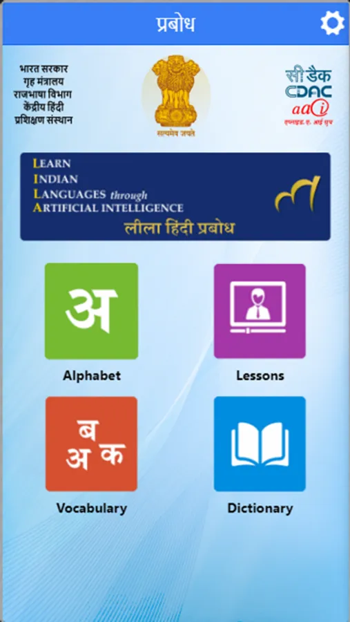 LILA-Rajbhasha (Learn Indian Languages through Artificial intelligence) is a multi-media based intelligent self-tutoring application for learning Hindi. Using LILA, learning a language on your mobile can indeed be as enjoyable as playing. Hindi Prabodh, Praveen and Pragya packages offer a user-friendly and effective tool to learn Hindi through the medium of English, Assamese, Bangla, Bodo, Gujarati, Kannada, Kashmiri, Malayalam, Manipuri, Marathi, Nepalese, Odia, Punjabi, Tamil and Telugu.