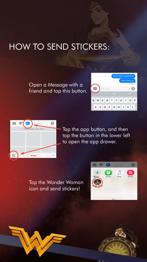 These Wonder Woman Stickers are for iMessage only. Please follow instructions shown on the screen shots to install and use. Your Wonder Woman stickers will show in your iMessage tray. If the Wonder Woman icon doesn't show in your tray, go to MANAGE and enable the Wonder Woman sticker pack. Enjoy these stickers and the Wonder Woman film.