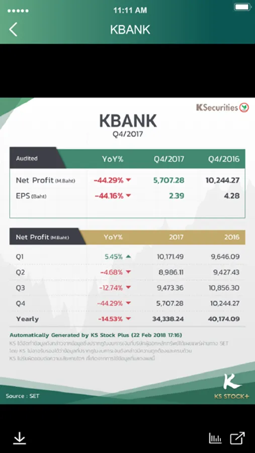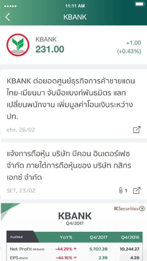 - ติดตามข้อมูลข่าวของหุ้นที่สนใจ จากแหล่งข่าวที่น่าเชื่อถือ สรุปงบการเงินจากระบบอัตโนมัติ และบทวิเคราะห์จากหลักทรัพย์กสิกรไทย