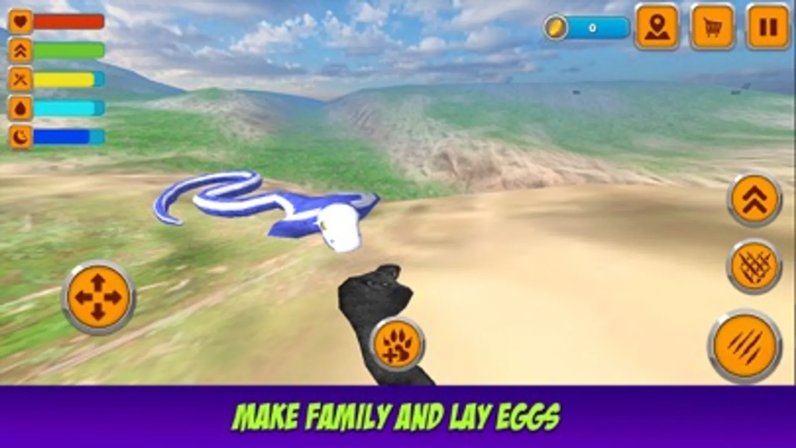 Check our new game for all the snakes’ lovers! Build your own nest, try to find a mate, lead it to your lair and create your own family! Don’t forget to protect your eggs, otherwise cruel wild predators could ruin it and kill all your little nestlings! Transport enough food to your family, protect it from foxes, cats, scorpions, and other wild animals’ attacks and just enjoy!