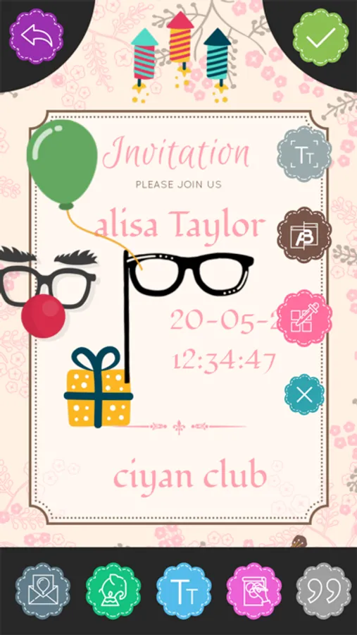 Make beautiful and Custom Party invitation cards.Create Custom Invitation cards easily by adding date,time,text,decoration,Save it and share to your loved ones.Also set custom photo as your card background.Decorate card with Text quotes, stickers and multi-colored themes.