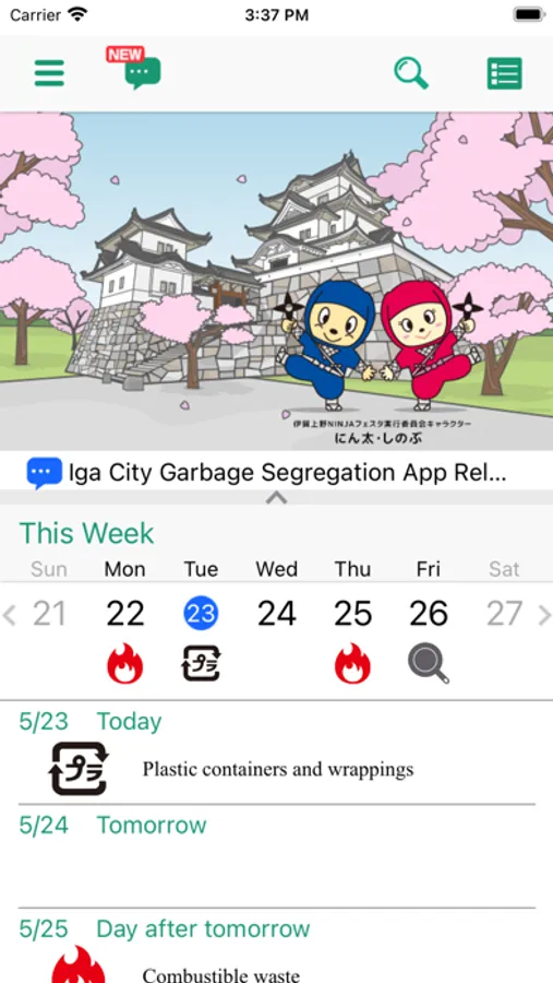 Iga City has released an application that allows users to easily check various information about garbage, such as the date of garbage collection, how to take out garbage, cautions when putting it out, and a garbage separation dictionary, using a familiar smartphone.