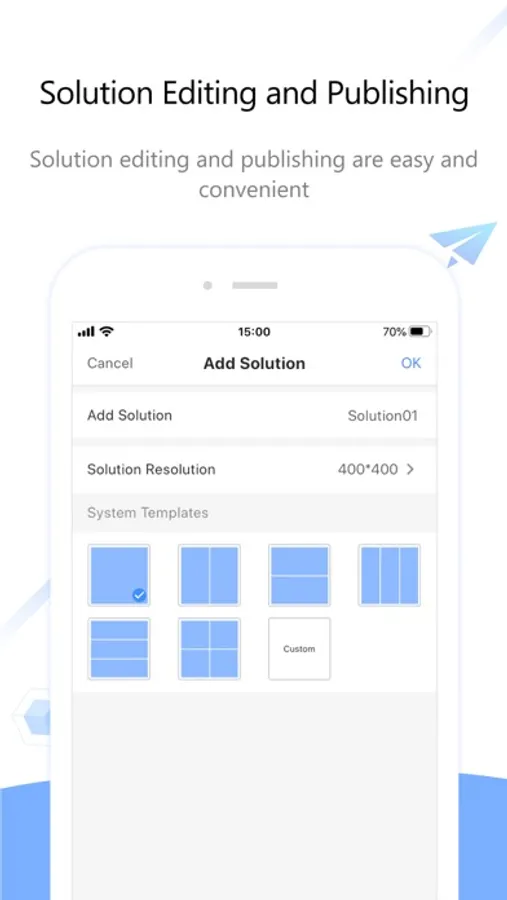 This application supports functions like screen management, solution editing, system settings, and media library.
