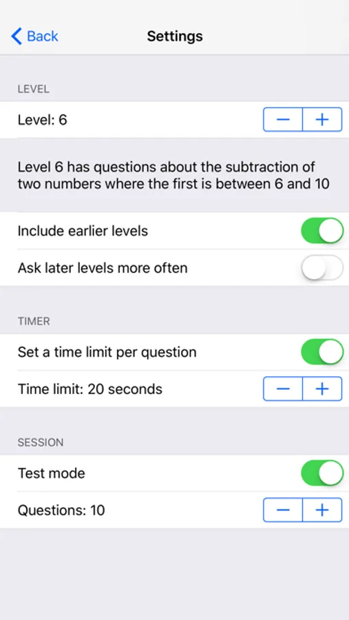 You can choose to set a time limit on each question, or allow the child to take as long as they need. If the time limit runs out then the answer is shown. You can also set a test, where the child is asked a specific number of questions.