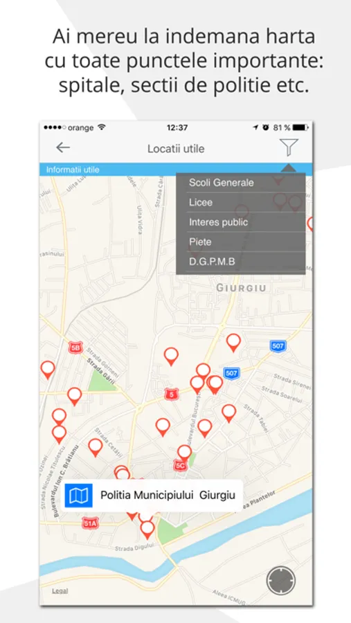 De asemenea, aplicatia iti afiseaza pe harta locatii de interes, cum sunt: spitale, sectii de politie, scoli, gradinite, piete, muzee etc., cu posibilitatea de navigare catre adresa.