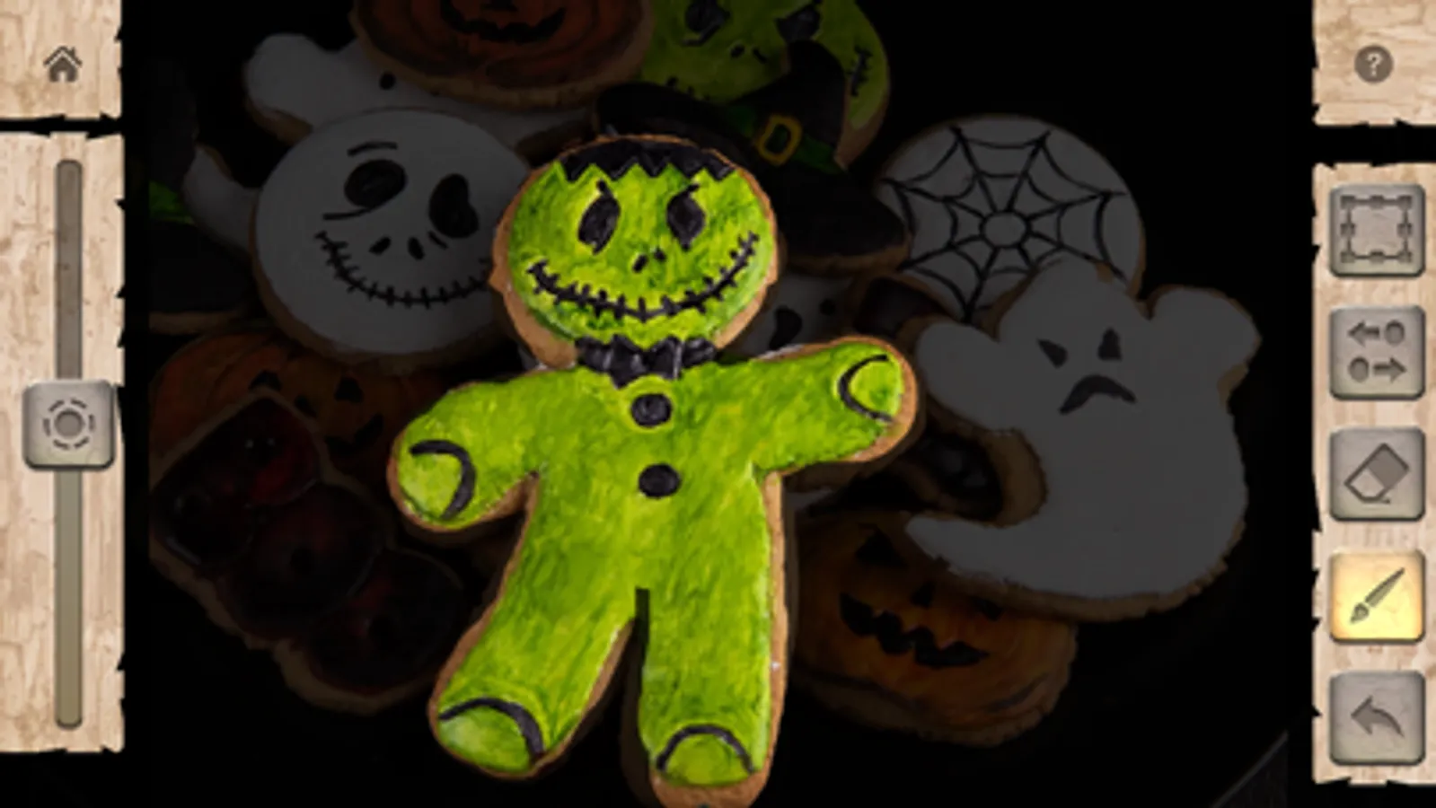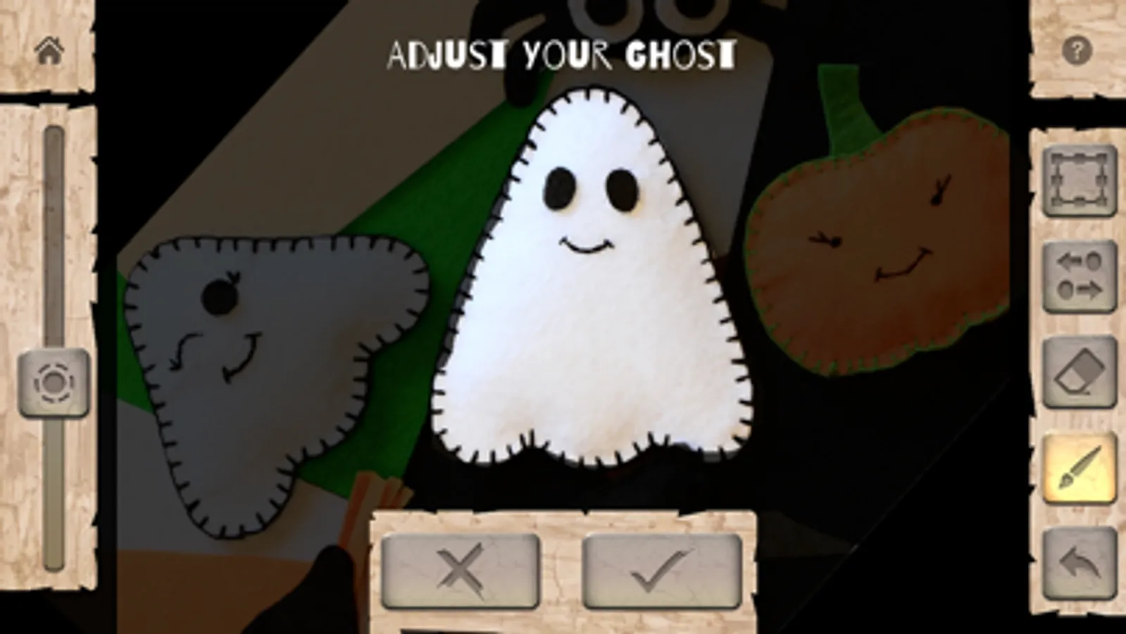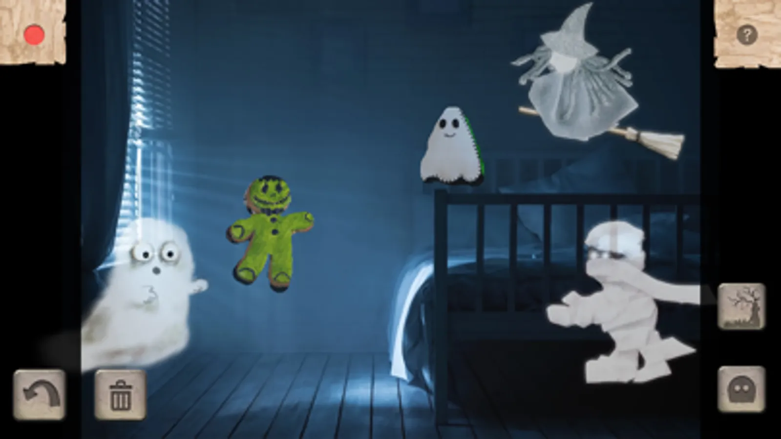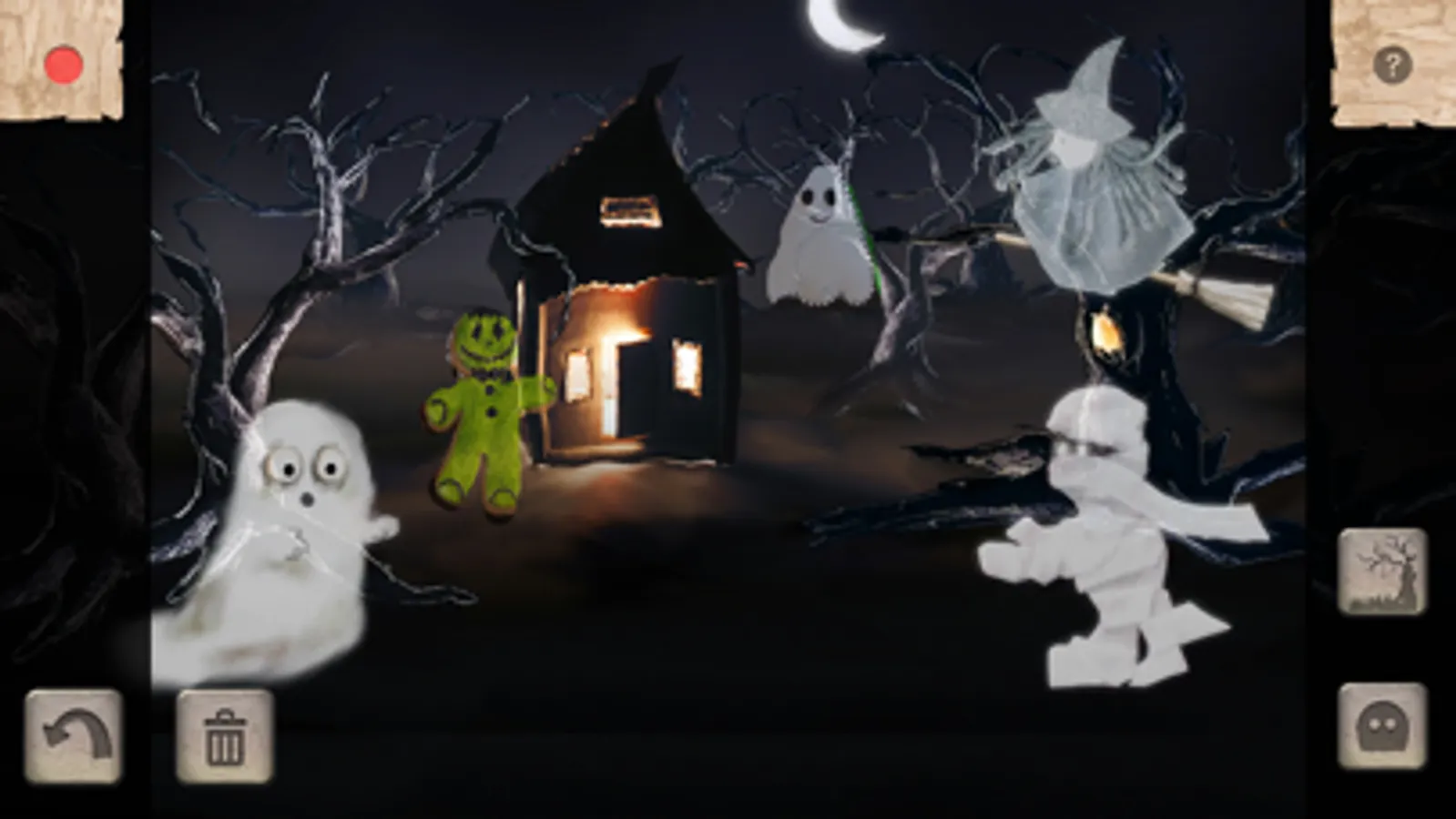 Ghost Story comes with several cute-scary characters in a handmade arts and crafts style. Drag them around the screen to move them wherever you want. You can also add your own characters by tapping the Ghost button and snapping a photograph or importing one. The most fun is to make your own arts and crafts characters and photograph those! You could also use your toys, objects from around the house, or even people and pets.