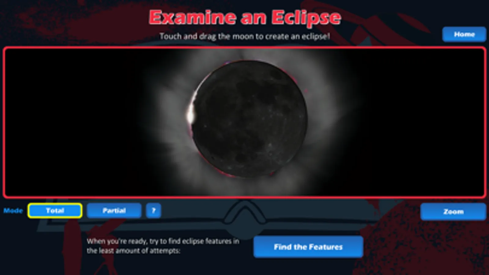 • Eclipse: make your own eclipse by dragging the moon in front of the Sun, and discover eclipse features like the “diamond ring” and the Sun’s corona. This also has a challenge mode where you’re asked to not only find various features, but identify the point in an eclipse when they appear.